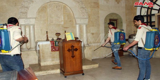 شباب الكشاف من طائفة السريان الأرثوذكس يعقمون الكنائس في حلب