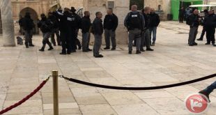 وقال المنسق الإعلامي في دائرة الأوقاف الإسلامية بالقدس فراس الدبس لوكالة الصحافة الفلسطينية صفا ..” إن نحو 30 مستوطنا متطرفا اقتحموا منذ ساعات الصباح المسجد الأقصى على مجموعات وبحراسة شرطية مشددة ونظموا جولة في أنحاء متفرقة من باحاته” بينما قامت شرطة الاحتلال المتمركزة على البوابات باحتجاز البطاقات الشخصية للنساء والشبان الوافدين للأقصى وتفتيش حقائبهم بشكل استفزازي والتضييق عليهم قبيل دخولهم للمسجد وسط انتشار مكثف للشرطة والقوات الخاصة داخل باحات الأقصى وعلى بواباته الداخلية والخارجية.