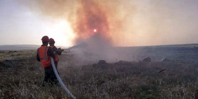 وأوضح العميد غياث عاقل مدير الدفاع المدني بحمص في تصريح لمراسلة سانا أن طواقم الإطفاء تمكنت من إخماد حريق نشب في حقل قمح كبير يمتد بين قريتي أم حارتين والسماقيات بمنطقة القصير في ريف حمص وطال نحو عشرة دونمات لافتاً إلى أن سبب الحريق يعود إلى ارتفاع درجات الحرارة.