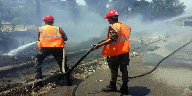 أخمد عناصر الدفاع المدني بحمص حريقا نشب اليوم بأشجار وأعشاب بالقرب من سوق الهال بحمص.
