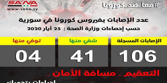 وأشارت الوزارة في بيان تلقت سانا نسخة منه إلى أن إجمالي عدد الإصابات بالفيروس المسجلة في سورية بلغ حتى اليوم 106 شفيت منها 41 وتوفيت 4 حالات.
