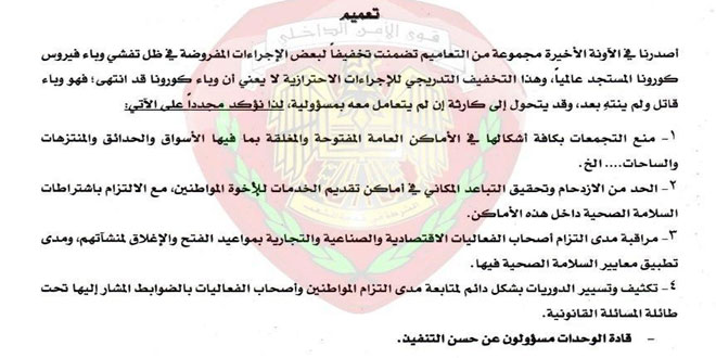 وأوضحت الوزارة في تعميم لها تلقت سانا نسخة منه أنها أصدرت في الآونة الأخيرة مجموعة من التعاميم تضمنت تخفيفا لبعض الإجراءات المفروضة في ظل تفشي وباء فيروس كورونا المستجد عالميا وهذا التخفيف التدريجي للإجراءات الاحترازية لا يعني أن وباء كورونا قد انتهى فهو وباء قاتل ولم ينته بعد وقد يتحول إلى كارثة إن لم يتعامل معه بمسؤولية.