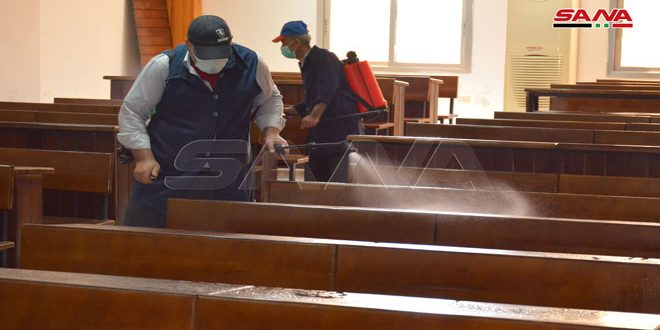 وأوضح رئيس الجامعة الدكتور بسام حسن لمراسل سانا اليوم أن مديرية الشؤون الهندسية والخدمات في الجامعة وضعت برنامجاً لعمليات التنظيف والتعقيم في مباني الجامعة حيث بذل العاملون فيها جهوداً مضاعفة لإنجاز الأعمال المطلوبة في الوقت المحدد كما تم تحديد المستلزمات الضرورية من أجهزة قياس حرارة وكمامات وكفوف وكحول ومواد التعقيم اللازمة.