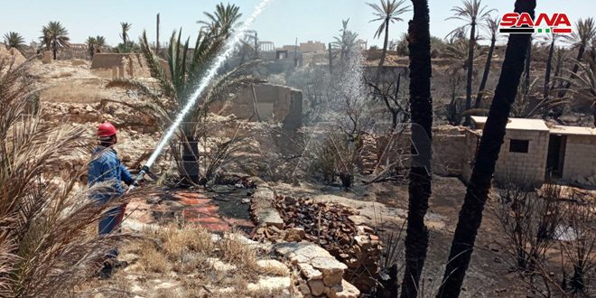 وتمكنت الجهات المعنية في تدمر وحمص الثلاثاء الماضي من السيطرة على الحريق الهائل الذي طال نحو مئتي هكتار من مساحة أشجار واحة النخيل والزيتون التاريخية الواقعة على الأطراف الجنوبية لمدينة تدمر وإخماده.