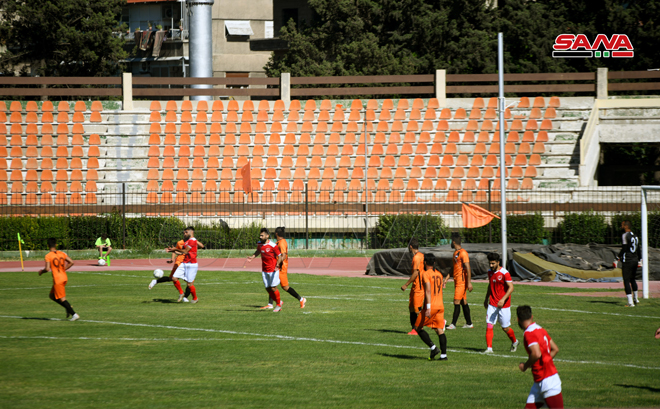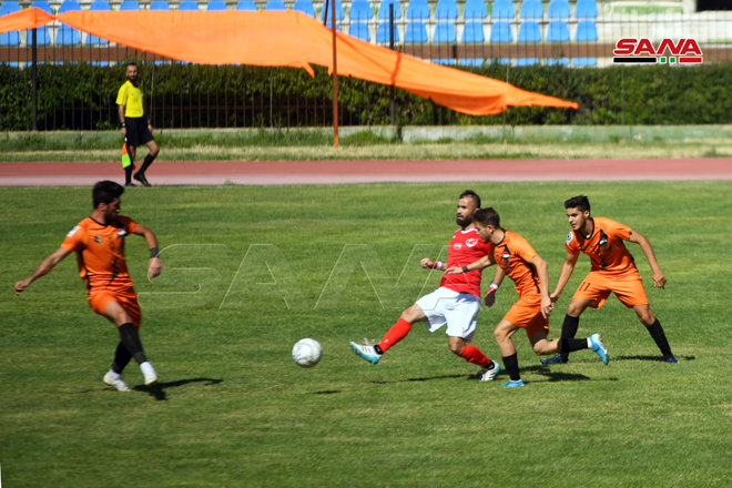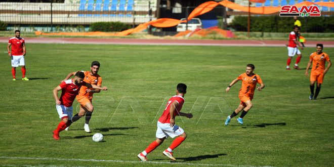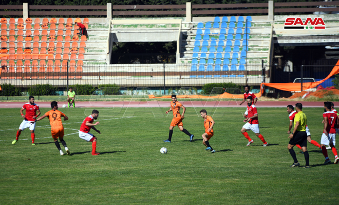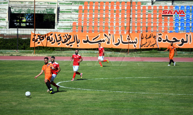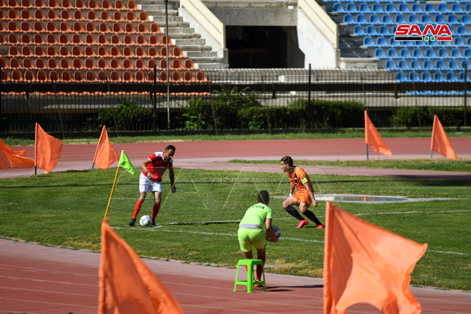 من مباراة فريقي الوحدة والجزيرة في دمشق اليوم بعد استئناف مباريات الدوري الممتاز لكرة القدم بعد توقف استمر قرابة الشهرين بسبب الإجراءات الاحترازية للتصدي لفيروس كورونا.. انتهت المباراة بتعادل الفريقين 2-2