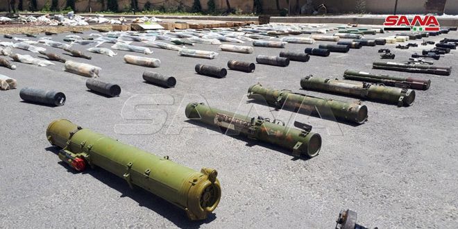 وفي تصريح لمراسل سانا أشار مصدر في الجهات المختصة إلى أنه “من خلال المتابعة وفي إطار عمليات تطهير المناطق المحررة من مخلفات الإرهابيين تم العثور على كميات كبيرة من الأسلحة الخفيفة والمتوسطة والذخائر من بينها بنادق أمريكية المنشأ وصواريخ مضادة للدروع”.