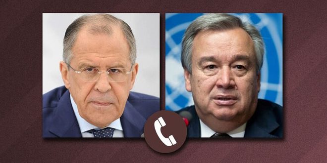 وجاء في بيان صدر عن وزارة الخارجية الروسية وفق ما نقل موقع روسيا اليوم أن لافروف وغوتيريس تبادلا خلال اتصال هاتفي الآراء بشأن الأوضاع في سورية وشددا على ضرورة ضمان الأمن والاستقرار والحفاظ على وحدة الأراضي السورية وسيادتها واستقلالها مشيرين إلى خطر ممارسات الإرهابيين في سورية على خلفية جائحة فيروس كورونا.