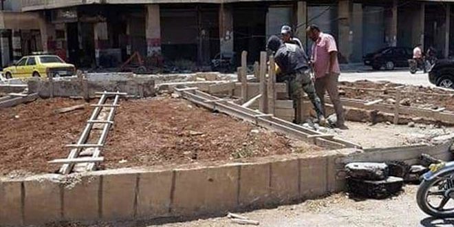 باشر المجلس البلدي بمدينة داريا في ريف دمشق بتأهيل ساحة ودوار الباسل بالتزامن مع مشروع إعادة صيانة شبكة الصرف الصحي في طريق الكورنيش.
