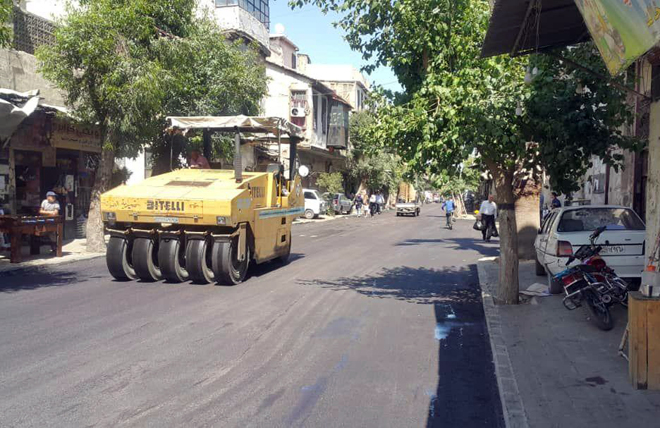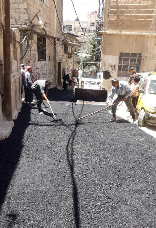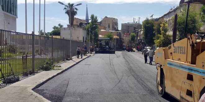 وتواصل ورشات الصيانة وفق حمامية أعمال تزفيت الشارع الرئيسي والحارات الفرعية بالقرب من جامع دمر الكبير في منطقة دمر البلد لافتا إلى أن الورشات تقوم بأعمال تأهيل منصف الطريق في نهر عيشة وتبليط الأرصفة وتركيب الأطاريف على جانبيه إضافة لصيانة الأرصفة والأطاريف في شارع الثورة وباب الصغير.