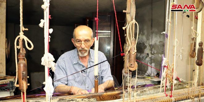 وحيداً خلف نول خشبي قديم يجلس الحرفي سامي نداف وهو يقوم بعمله على نوله الذي يعود إلى أكثر من مئة عام في لوحة تراثية تعود بنا إلى زمن ازدهرت فيه صناعة النسيج السوري ووصلت شهرته إلى دور الأزياء العالمية.