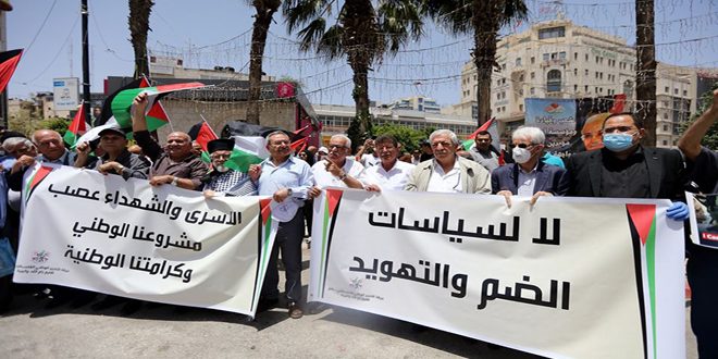 شارك مئات الفلسطينيين في مظاهرة بمدينة رام الله بالضفة الغربية اليوم رفضاً لمخططات الضم الإسرائيلية ولما تسمى (صفقة القرن) الرامية إلى تصفية القضية الفلسطينية.