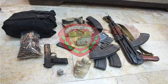 وبينت وزارة الداخلية في بيان لها تلقت سانا نسخة منه أن فرع الأمن الجنائي بمدينة اللاذقية ألقى القبض على شخصين قاما بالترويج لقطع أثرية حيث ضبط بحوزة الأول عملة أثرية كان يروج لبيعها بمبلغ 25 ألف دولار كما ضبط بحوزة الآخر بارودة حربية مع 8 مذخرات وذخيرتها 200 طلقة حية ومسدسا حربيا مع 10 طلقات حية وجعبتين وتمثالين أثريين وسيارة كيا ريو.