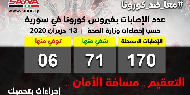 أعلنت وزارة الصحة اليوم تسجيل ست إصابات جديدة بفيروس كورونا لأشخاص مخالطين في بلدة رأس المعرة بريف دمشق ليرتفع عدد الإصابات المسجلة في سورية إلى 170 وشفاء ثلاث حالات جديدة.