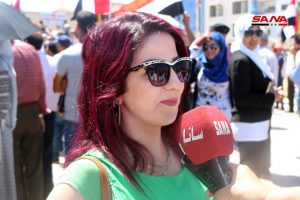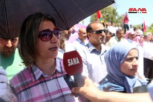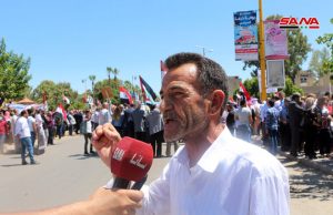ابراهيم الكفري رئيس اتحاد الحرفيين بدرعا قال: إن وقفة اليوم رسالة موجهة لأمريكا وحلفائها بأن الشعب السوري لن يستكين وسيواصل صموده حتى تحقيق النصر.