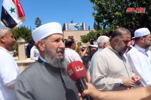 الشيخ فيصل برماوي إمام مسجد علي بن أبي طالب في مدينة درعا أشار إلى أن الفعاليات الدينية تقف مع الوطن ضد الحصار الجائر على الشعب السوري ونقول لترامب: إن الحصار لا بد أن ينكسر بإرادة السوريين.