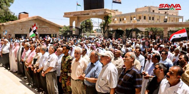 أكد المشاركون في الوقفة الوطنية في محافظة دير الزور رفضهم واستنكارهم للإجراءات القسرية أحادية الجانب المفروضة على الشعب السوري وتنديدهم بما يسمى قانون قيصر مشددين على التمسك بالثوابت الوطنية والوقوف مع الوطن لمواجهة الحرب الاقتصادية.