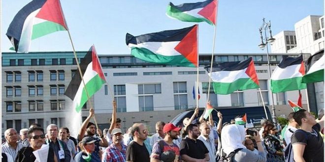 نظم أبناء الجالية الفلسطينية المقيمون في ألمانيا وقفة احتجاجية أمام السفارة الأميركية في برلين رفضاً لمخططات الاحتلال الإسرائيلي ضم أجزاء من الضفة الغربية.