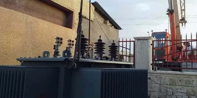 باشرت الشركة العامة لكهرباء محافظة الحسكة أعمال تركيب محولة كهربائية استطاعة 630 ك ف لتأمين التغذية الكهربائية للكليات الجامعية في المدخل الجنوبي للحسكة بعد خروجها عن الخدمة جراء الإرهاب.