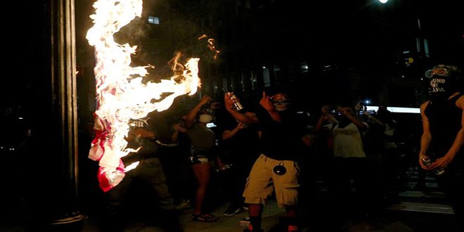 في تحد واضح لتهديدات الرئيس الأمريكي دونالد ترامب باستخدام القوة ضد المحتجين المناهضين للعنصرية ومعاقبة من يقوم بتدمير تمثال أو نصب تذكاري أقدم عشرات المتظاهرين على حرق العلم الأمريكي وسط العاصمة واشنطن مع استمرار الاحتجاجات التي تطالب بانهاء عنف الشرطة بحق الأمريكيين المتحدرين من أصول إفريقية.
