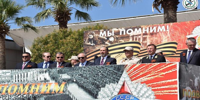 ممثلاً السيد الرئيس الفريق بشار الأسد القائد العام للجيش والقوات المسلحة شارك منصور عزام وزير شؤون رئاسة الجمهورية في الاحتفال الذي أقامته قيادة القوات الروسية العاملة في سورية في القاعدة العسكرية الروسية في حميميم اليوم بمناسبة الذكرى الخامسة والسبعين للانتصار على النازية في الحرب العالمية الثانية.