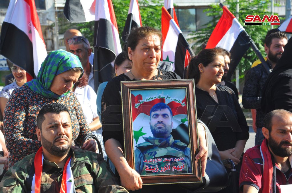 وأشارت عائشة الظاهر والدة الجريح أحمد جراد الحسن إلى أنها تشارك بهذه الوقفة تعبيرا عن رفضها للعقوبات الاقتصادية الأميركية على الشعب السوري بينما اعتبر أحمد البب ابن شهيد أن مشاركته تأكيد على مواصلة المسيرة والتصدي لكل من يحاول النيل من سيادة سورية مؤكداً أن سياسات الولايات المتحدة العدوانية تشكل خطراً على السلم العالمي.