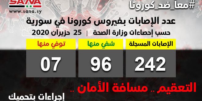 وبلغ عدد الإصابات المسجلة بفيروس كورونا في سورية حتى الآن 242 إصابة شفي منها 96 وتوفيت 7 حالات.