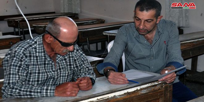 بإرادة وعزيمة وطموح لا ينتهي وبعكازه الذي يتلمس فيه الطريق يتنقل الكفيف أيمن ذياب شرف الدين مع موعد كل مادة امتحانية من قريته ريمة حازم بريف السويداء الغربي إلى المركز الامتحاني في مدرسة الشهيد سلمان دويعر بمدينة السويداء لتقديم امتحانات شهادة التعليم الأساسي لدورة العام الحالي.