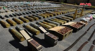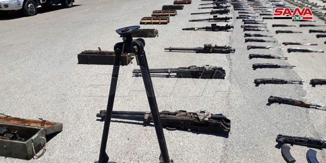وذكر مراسل سانا أنه من خلال متابعة تمشيط القرى المحررة بريف حلب الشمالي لتأمينها وضمان سلامة الأهالي العائدين إلى منازلهم عثرت الجهات المختصة على أسلحة وذخائر بينها رشاشات متوسطة ومدافع هاون وبنادق آلية وقذائف دبابات وقذائف “ار بي جي” وحشوات دافعة وكميات كبيرة من الذخيرة متنوعة العيارات.