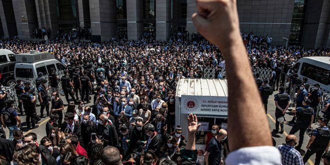 وخلال مظاهرة حاشدة أمام مجمع المحاكم في اسطنبول أكد رئيس نقابة المحامين في المدينة محمد دوراك أوغلو ضرورة “مواصلة النضال المشترك ضد نظام أردوغان الاستبدادي والمعادي للعدالة والدستور والقوانين والهادف للقضاء على كل أشكال المعارضة” داعياً كل النقابات والمنظمات والجمعيات الحقوقية إلى التصدي لمساعي أردوغان للسيطرة على الجهاز القضائي ليكون في خدمة مخططاته ومشاريعه.