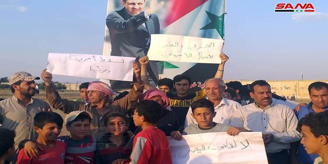 وذكر مراسل سانا في الحسكة أن العشرات من أهالي قرية خربة عمو بريف القامشلي الشرقي تجمعوا في ساحة القرية رافعين صور السيد الرئيس بشار الأسد والعلم الوطني ولافتات كتب عليها شعارات تندد بقوات الاحتلال الأمريكي والتركي وبما يسمى (قانون قيصر) الأمريكي الجائر الذي تريد منه أمريكا ضرب إرادة السوريين الذين صمدوا وحاربوا بقوة الإرهاب المدعوم من قبلها والدول التي تدور في فلكها.