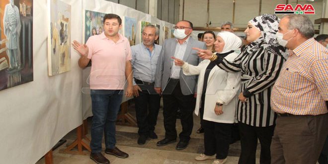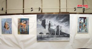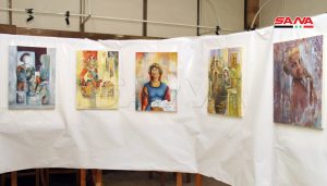 إحدى المشاركات بالمعرض الطالبة ناريمان قاسم اوضحت ان لوحتها تعبر عن حضارة وتراث حلب محاولة دمج عدة لوحات بلوحة واحدة لتتمكن من الوصول لروح الفن والألوان المستخدمة الزيتية أما الطالبة فيروز بكر فعبرت من خلال لوحتها عن المرأة الريفية والثقة بالنفس مستخدمة الوانا زيتية كونها تعبر عن الفرح.