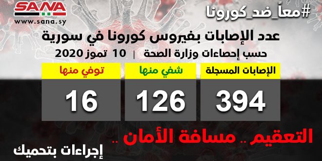 وأشارت الوزارة في بيان تلقت سانا نسخة منه إلى أن عدد الإصابات المسجلة بفيروس كورونا في سورية بلغ حتى الآن 394 إصابة شفيت منها 126 وتوفيت 16 حالة.
