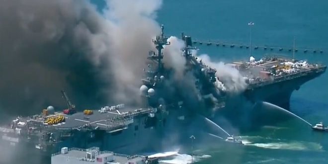 وأظهرت القنوات التلفزيونية الأمريكية دخانا كثيفا يتصاعد من السفينة وانتشارا لقوارب الإطفاء حولها إخماد الحريق.