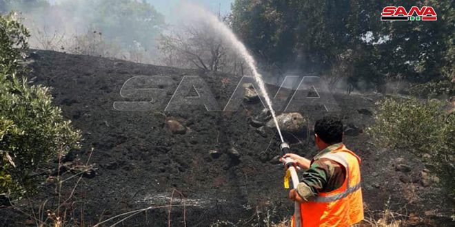 وذكر العقيد عثمان جودا قائد فوج إطفاء حمص في تصريح لمراسل سانا أن عناصر الفوج بالتعاون مع كوادر الدفاع المدني ومديرية الزراعة أخمدوا حريقا واسعا نشب بنحو 300 دونم من بساتين الزيتون والكرمة في قريتي المحفورة وعرقايا بالريف الغربي للمحافظة.