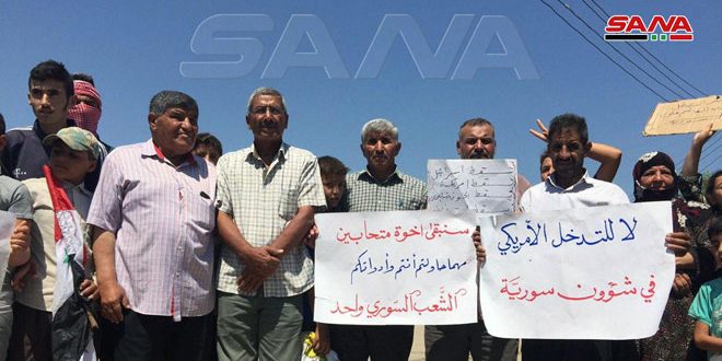 ورفع أهالي القرية العلم الوطني ورددوا شعارات تندد بما يسمى “قانون قيصر” الأمريكي مطالبين بالوقوف صفاً واحداً لإخراج قوات الاحتلال ومنعها من سرقة ونهب خيرات البلاد وتهريبها.