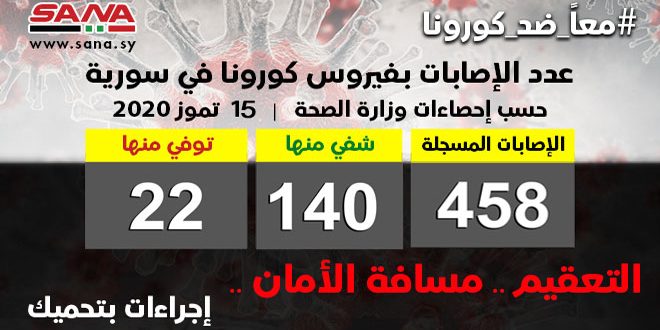 وأشارت الوزارة في بيان تلقت سانا نسخة منه اليوم إلى أن عدد الإصابات المسجلة في سورية حتى الآن بلغ 458 شفيت منها 140 وتوفيت 22 حالة.