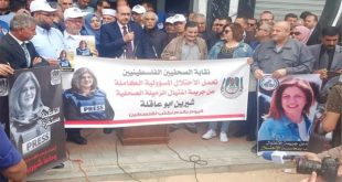 وذكرت وكالة وفا أن المشاركين في الوقفة التي نظمتها نقابة الصحفيين وشؤون الأسرى والمحررين ونادي الأسير أمام مقر الصليب الأحمر في جنين اليوم شددوا على أن الشعب الفلسطيني سيواصل نضاله في الدفاع عن حقوقه المشروعة ورفع صوت الحق من أجل فضح جرائم الاحتلال بحقه.