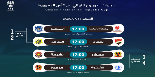 تنطلق اليوم عند الساعة الخامسة مساء منافسات الدور ربع النهائي من مسابقة كأس الجمهورية لكرة القدم بأربعة لقاءات موزعة على ملاعب في مختلف المحافظات.