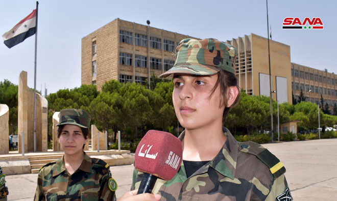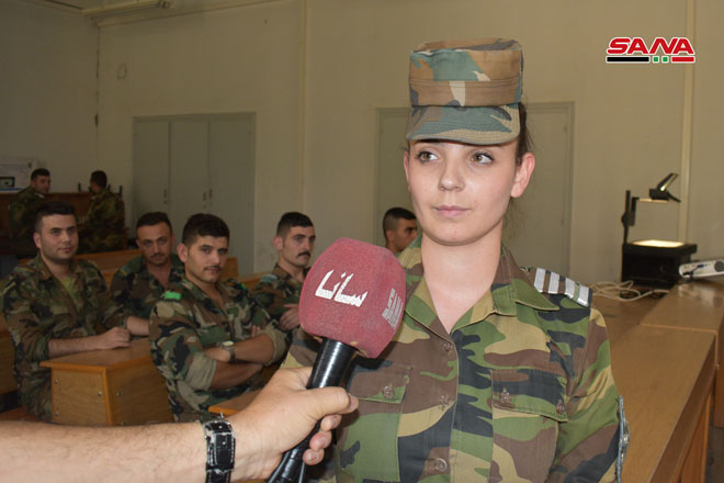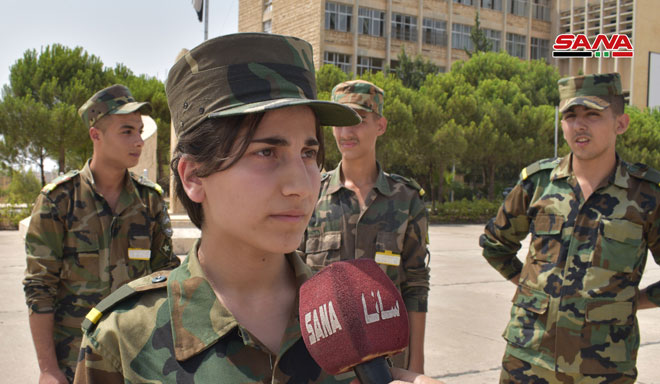 كما قدمت الطالبة ساندرا التهاني بمناسبة ذكرى تأسيس الجيش العربي السوري لجميع المقاتلين على الجبهات مؤكدة أن دماء الشهداء حققت الانتصارات على الأعداء ورسمت دروباً نواصل السير عليها لصنع النصر الأعظم بدحر الإرهاب عن كامل الجغرافيا السورية وقالت نتابع اليوم تلقي الدروس التدريبية والعلوم العسكرية لنكون رديفاً لأبطال الجيش من أجل بناء الوطن.