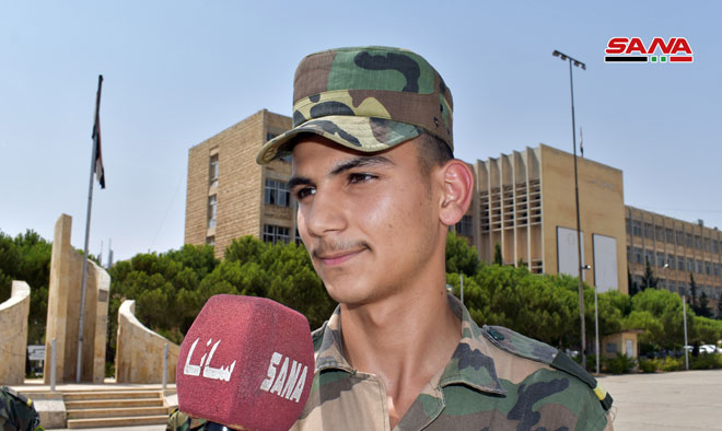 وبمناسبة عيد الجيش جال مراسل سانا في أحد صروح العلم العسكري وهو أكاديمية الأسد للهندسة العسكرية في حلب حيث أوضح الطالب حيدر أن الجيش العربي السوري كان وما زال مصنع البطولات.. بتضحيات جنوده حقق النصر وبدماء شهدائه حمى الوطن وقدم التهنئة بهذه الذكرى لأهالي الشهداء متمنياً الشفاء العاجل لجميع جرحى الجيش ومؤكداً التزامه بالعلم والتدريب ليكون مقاتلاً مسلحاً بالعلم والبندقية في صفوف الجيش العربي السوري لمحاربة الإرهاب وحماية الوطن.