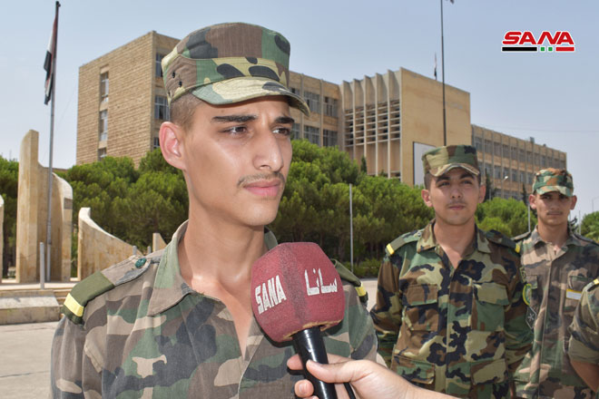 من جهته أكد الطالب محمد أن ذكرى تأسيس الجيش العربي السوري غالية على قلوبنا حيث تمكن أبطاله وعلى مدى التاريخ من إلحاق الهزائم بالعدو منذ التصدي للصهاينة في عدوانهم على فلسطين في الأربعينيات مروراً بالعدوان الثلاثي على مصر ثم حرب تشرين التحريرية وحرب تموز مؤكداً الاستمرار بالتدريب ونهل العلوم العسكرية والعمل على بناء الوطن والدفاع عنه.