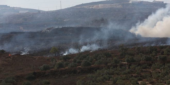 اعتدت قوات الاحتلال الإسرائيلي اليوم على أراضي الفلسطينيين في قرية المغير شرق رام الله في الضفة الغربية وتسببت باحتراق مساحات منها.