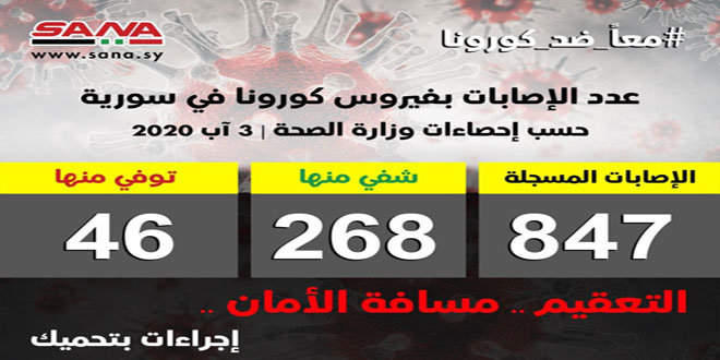 وأشارت الوزارة في بيان تلقت سانا نسخة منه اليوم إلى أن حصيلة الإصابات المسجلة في سورية حتى الآن بلغت 847 شفيت منها 268 وتوفيت 46 حالة.