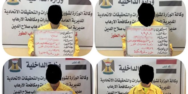 ونقل موقع السومرية نيوز عن وكالة الاستخبارات والتحقيقات الاتحادية قولها إن مفارزها بمحافظة صلاح الدين تمكنت بعد ورود معلومات استخبارية من إلقاء القبض على ستة إرهابيين بمناطق متفرقة من المحافظة مشيرة إلى أنه من خلال التحقيقات الأولية معهم اعترفوا بانتمائهم لتنظيم “داعش” الإرهابي واشتراكهم بعدة عمليات ضد القوات الأمنية والمواطنين.