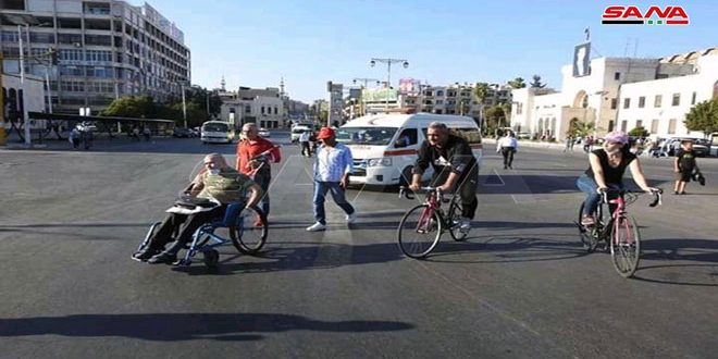 الجريح ديوب من أهالي قرية المحروسة في ريف مصياف وأصيب بشلل في أطرافه السفلية جراء إصابته الحربية خلال مواجهة الإرهابيين في محافظة حلب انطلق من أمام مبنى محافظة حماة في ساحة العاصي وهو يتسلح بإرادة صلبة وعزيمة قوية صقلها خلال قتاله التنظيمات الإرهابية وهو في صفوف قوات الدفاع الوطني التي قارعت أعداء الوطن إلى جانب الجيش العربي السوري.