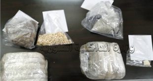 وفي سياق متصل بينت الوزارة أن فرع مكافحة المخدرات بدمشق تمكن من إلقاء القبض على شخصين في منطقة “المزة” وضبط بحوزتهما كمية ثمانمئة وعشرين غراما من مادة الحشيش المخدر ومئة وتسعين حبة كبتاغون مخدرة وشخص آخر في منطقة “القدم” تم العثور بمنزله على خمسمئة وتسع وخمسين حبة كبتاغون مخدرة وخمسة غرامات حشيش مخدر وبندقية صيد غير مرخصة وآخر عثر بمنزله الكائن بركن الدين على حبوب مخدرة متنوعة وكمية ثمانمئة وعشرين غراماً من مادة الحشيش المخدر وميزان الكتروني.
