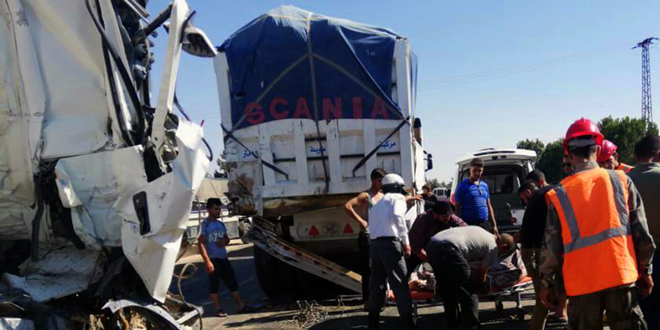 وأفاد مصدر في فرع مرور حمص لمراسل سانا بأن الحادث نجم عن تصادم شاحنتين إحداهما قاطرة مقطورة والأخرى سطحة قرب بلدة حسياء مشيراً إلى أن سبب الحادث السرعة الزائدة وعدم الانتباه.