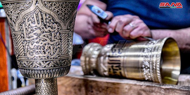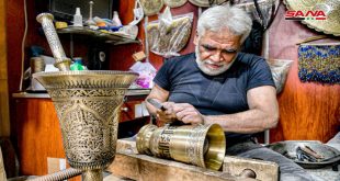 دمشق-سانا مطرقة حديد وأقلام للحفر والتخطيط وقاعدة خشبية وبيكار.. أدوات يبدأ بها العم أيمن زردة …