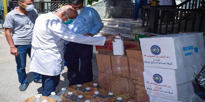 في إطار المساهمة الأهلية والمجتمعية لمؤازرة الجهود الحكومية في التصدي لفيروس كورونا أطلقت غرفة صناعة دمشق وريفها اليوم مبادرة لدعم القطاع الصحي تضمنت توزيع دفعة هي الأولى من الكمامات والمعقمات على عدد من مشافي دمشق العامة.