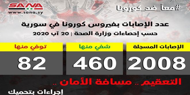 وأشارت الوزارة في بيان تلقت سانا نسخة منه اليوم إلى أن حصيلة الإصابات المسجلة بلغت حتى الآن 2008 شفيت منها 460 حالة وتوفيت 82.